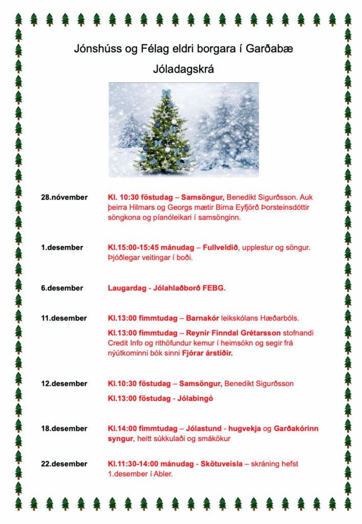 Jóladagskrá Jónshúss og FEBG Jóladagskrá Jónshúss og FEBG admchar_febg992025-11-28T14:12:12+00:0028.11.2025|Fréttir| Related Posts Kynning þann 5. febrúar kl. 14:00 á ferðum á vegum FEBG árið 2026 03.02.2026 Aðalfundur FEBG þann 26. febrúar 2026 kl. 13.30 02.02.2026 Skotlandsferðakynning – Glærur frá kynningu 23.01.2026 Skotlandsferðakynning – 22. janúar í Jónshúsi 15.01.2026