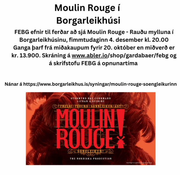 FEBG efnir til ferðar að sjá Moulin Rouge – Rauðu mylluna í Borgarleikhúsinu, fimmtudaginn 4. desember kl. 20.00. Ganga þarf frá miðakaupum fyrir 20. október en miðaverð er kr. 13.900.