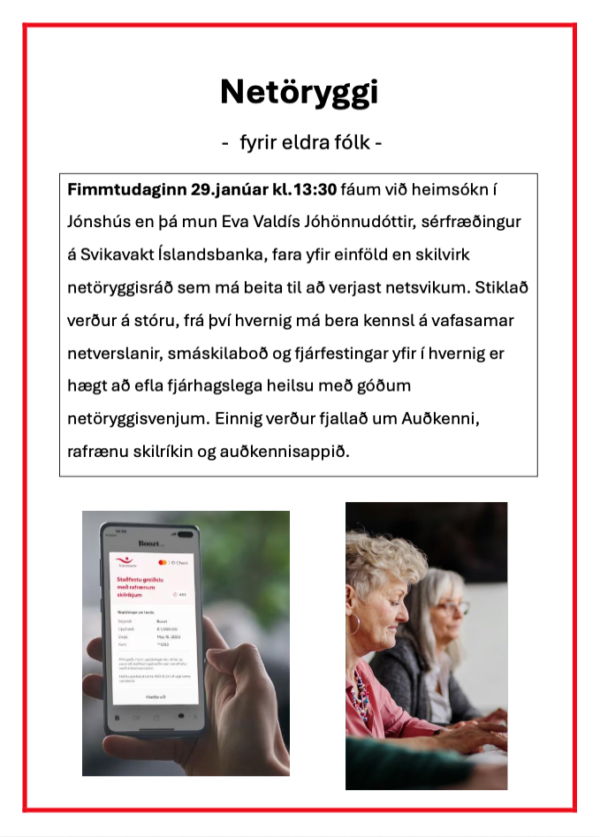 Fimmtudaginn 29.janúar kl.13:30 fáum við heimsókn í Jónshús en þá mun Eva Valdís Jóhönnudóttir, sérfræðingur á Svikavakt Íslandsbanka, fara yfir einföld en skilvirk netöryggisráð sem má beita til að verjast netsvikum. Stiklað verður á stóru, frá því hvernig má bera kennsl á vafasamar netverslanir, smáskilaboð og fjárfestingar yfir í hvernig er hægt að efla fjárhagslega heilsu með góðum netöryggisvenjum.